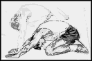 b) Keeping arms folded across chest, tilt pelvis to flatten back. Tuck chin into chest.